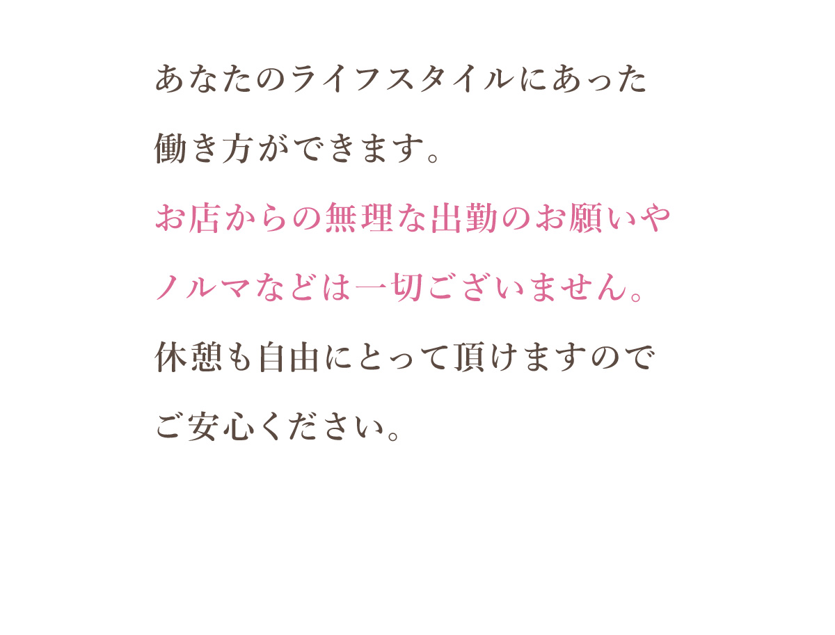 | 待 遇: | 完全全額日払い制・給与保証あり・雑費なし、制服無料貸し出し、帰宅送迎あり・完全自由出勤、WワークOK、罰金ノルマなし |